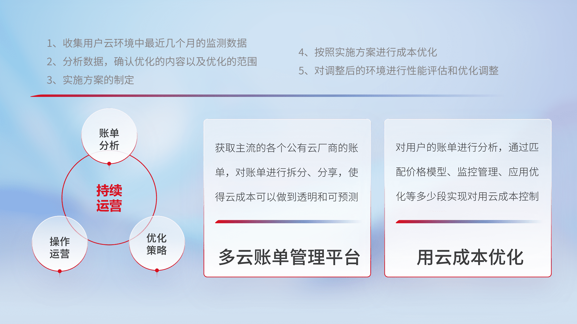 通过多云纳管,,,,以统一的资源数据模型把客户的云资源进行抽象和封装,,,进而实现对多云资源的统一操作,,保障云资源管理的可靠性、、、、稳定性与可用性。。。量身定制化运维内容,,,配置、、开发运维、、、、补丁管理、、、、备份、、、监控、、、、认证和访问管理、、审计和日常巡检等,,保障在用云过程中的可靠度,,,稳定度以及高可用率。。。。